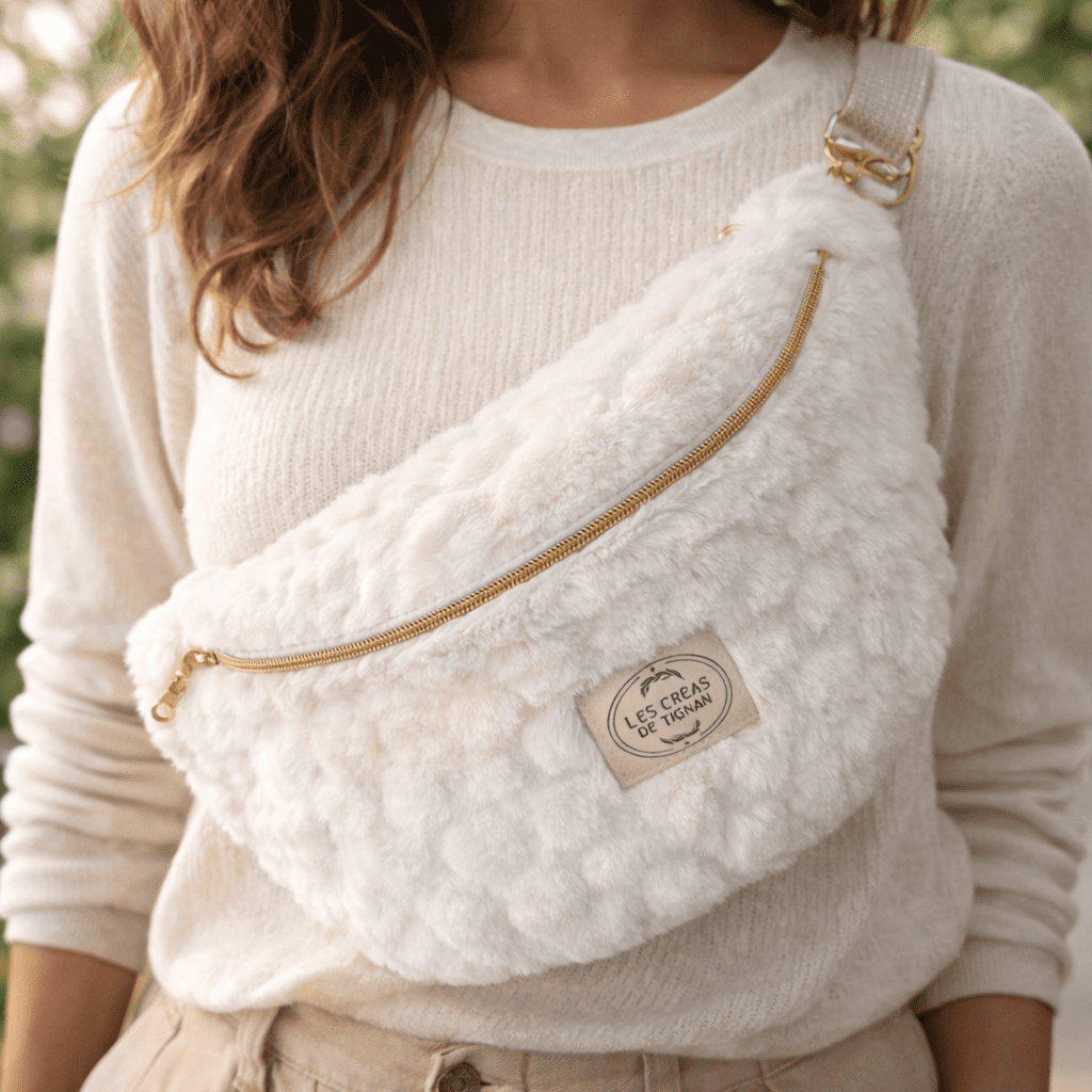 Sac banane Ivory Touch – Écrue en fausse fourrure ultra douce, avec fermeture zippée dorée et sangle réglable. Compact, pratique et élégant, parfait pour garder vos essentiels à portée de main avec style.