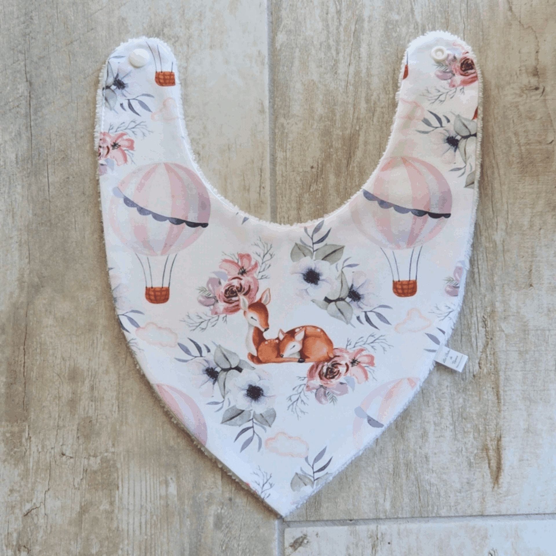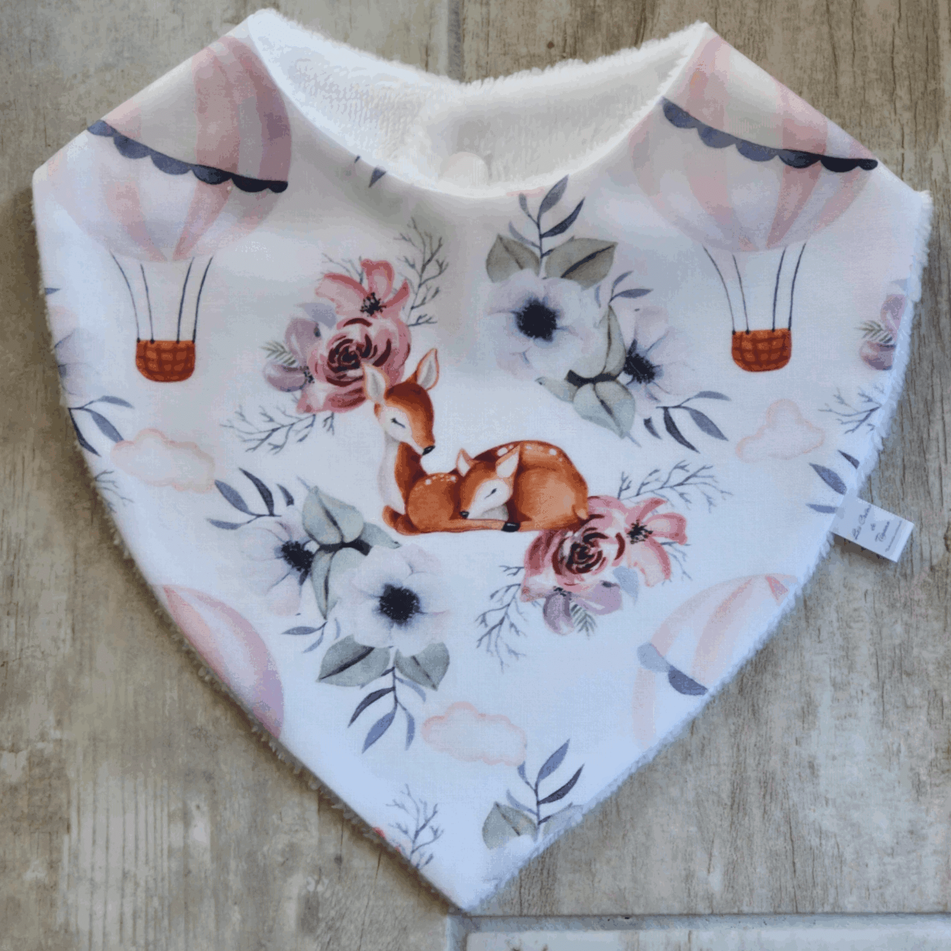 Offrez à votre bébé confort, douceur et style avec ce magnifique bavoir bandana en coton illustré de délicates montgolfières pastel, de jolies fleurs aquarellées et d'un tendre faon endormi. Conçu avec soin, ce bavoir allie praticité et élégance pour accompagner le quotidien de votre tout petit.