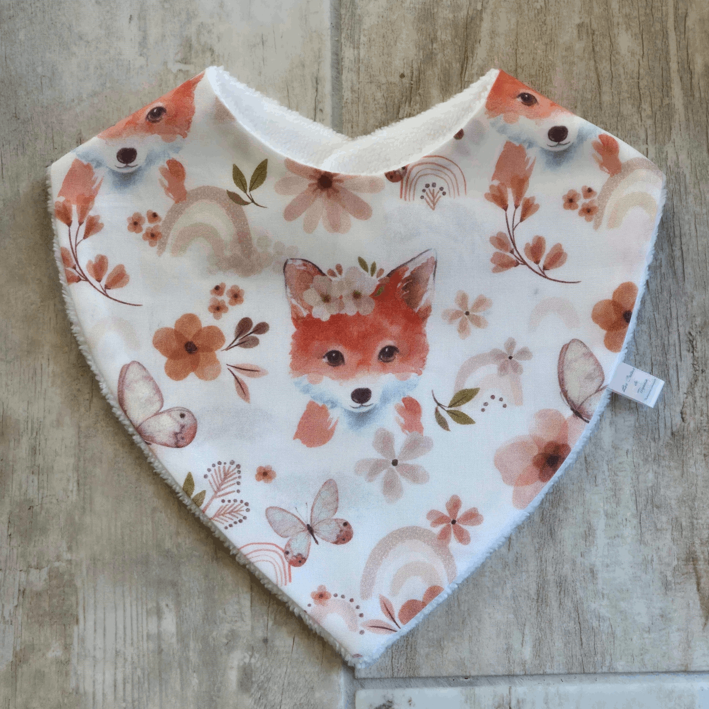 Bavoir en coton doux, motif renard et fleurs. Pratique, absorbant et original, idéal comme cadeau de naissance tendance ou pour le trousseau de bébé.