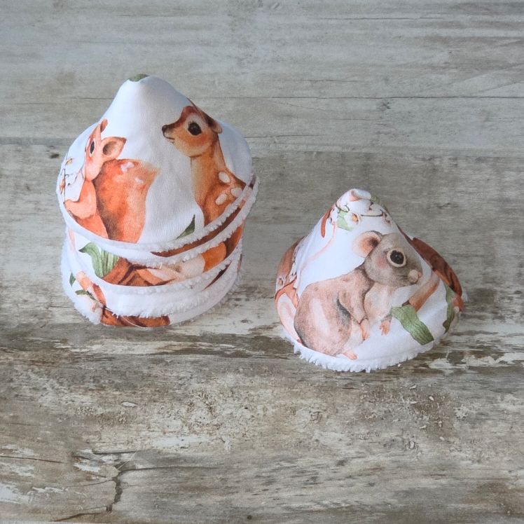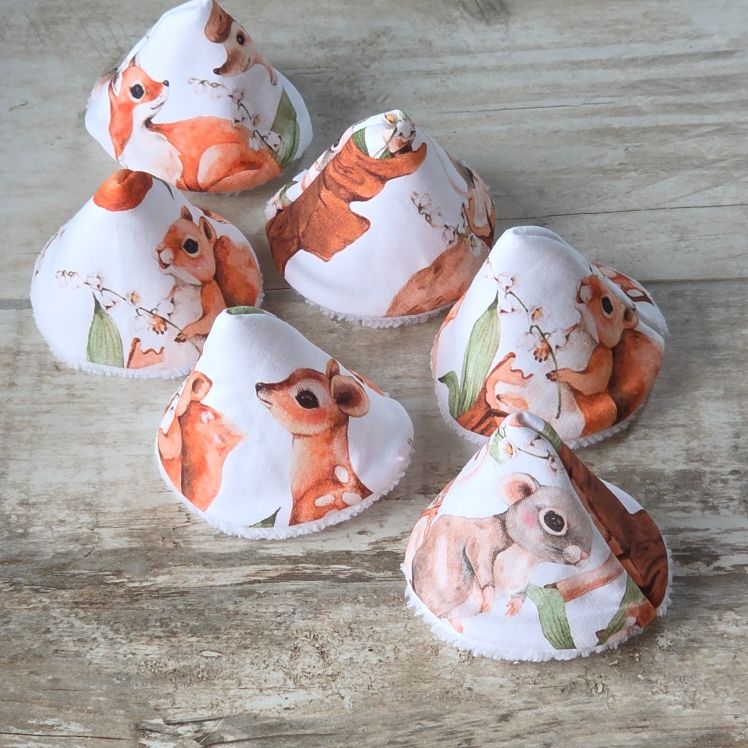 Chaque pièces est réalisée avec un tissu extérieur doux et coloré, et un intérieur absorbant en micro éponge de bambou afin de combiner confort et efficacité. Leur forme conique leur permet de bien tenir en place, et leur taille est parfaitement adaptée aux nourrissons.