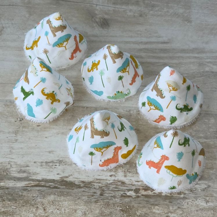 Chaque pièces est réalisée avec un tissu extérieur doux et coloré, et un intérieur absorbant en micro éponge de bambou afin de combiner confort et efficacité. Leur forme conique leur permet de bien tenir en place, et leur taille est parfaitement adaptée aux nourrissons.
